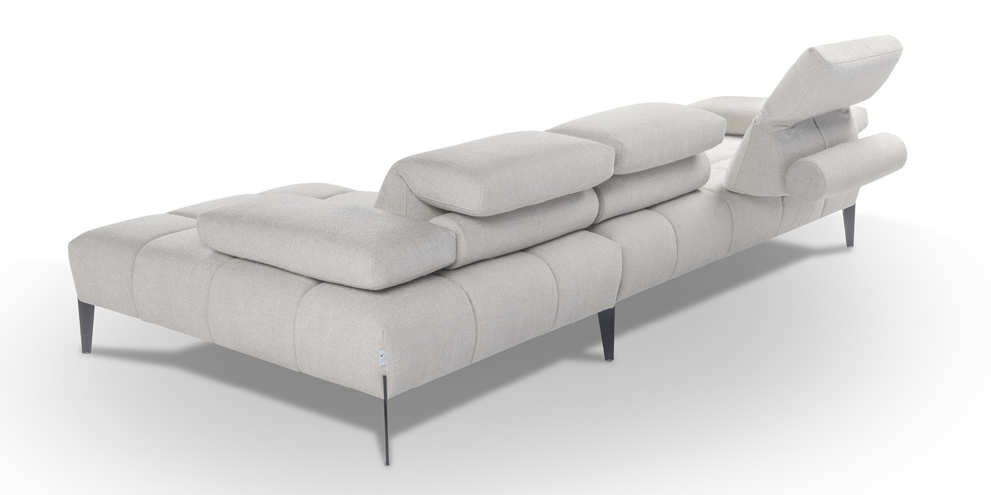 Skyline is a contemporary sofa distinguished by its compact seating, enhanced by a quilted effect. Elevated 19 cm off the ground, it features a continuous headrest integrated into the backrest and adorned with a bolster. The manually adjustable backrests and armrests, thanks to a tilting mecha-nism, extend the seat depth by 42 cm and the armrest width by 22 cm each. The armrest can be lifted in any position. The metal legs come in a standard matte black finish. Available in fixed or modular versions, in leather, fabric, or microfiber.
