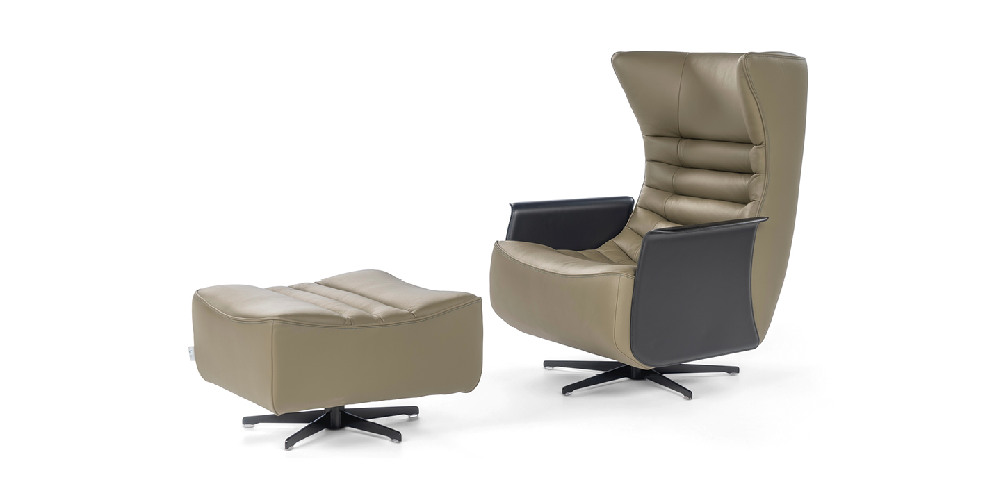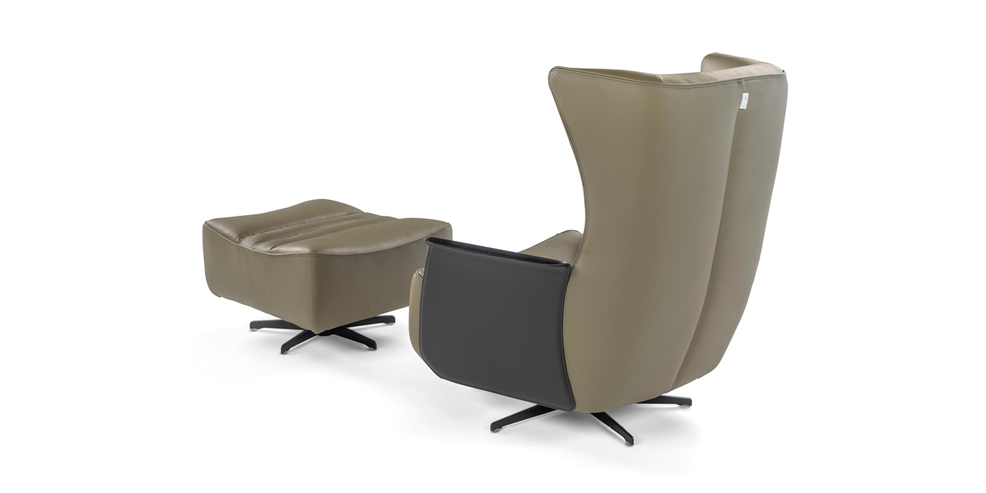 Generosa e accogliente, Gerrit è l’interpretazione in chiave moderna della classica poltrona da lettura, nuova e familiare allo stesso tempo. La parte interna della poltrona è arricchita da una lavorazione che ricorda una trapuntatura e che prosegue anche sul pouf, in continuità con la seduta. Il pouf ha una forma trapezoidale che richiama le geometrie della poltrona, integrandosi perfettamente. Poltrona e pouf sono disponibili nella versione fissa con piede in metallo o nella versione swivel che poggia su base a razze, adatta anche ad un contesto contract. In entrambe le versioni, fissa o swivel, la Gerrit può essere dotata di braccioli in cuoio rigenerato. Tutti i componenti (piede, base a razze e braccioli) sono disponibili in diverse finiture e/o colori che, abbinati al rivestimento scelto, possono dar vita a numerose combinazioni personalizzate. Il modello, disponibile in pelle o in tessuto interamente sfoderabile, presenta una profondità di soli 82 centimetri.