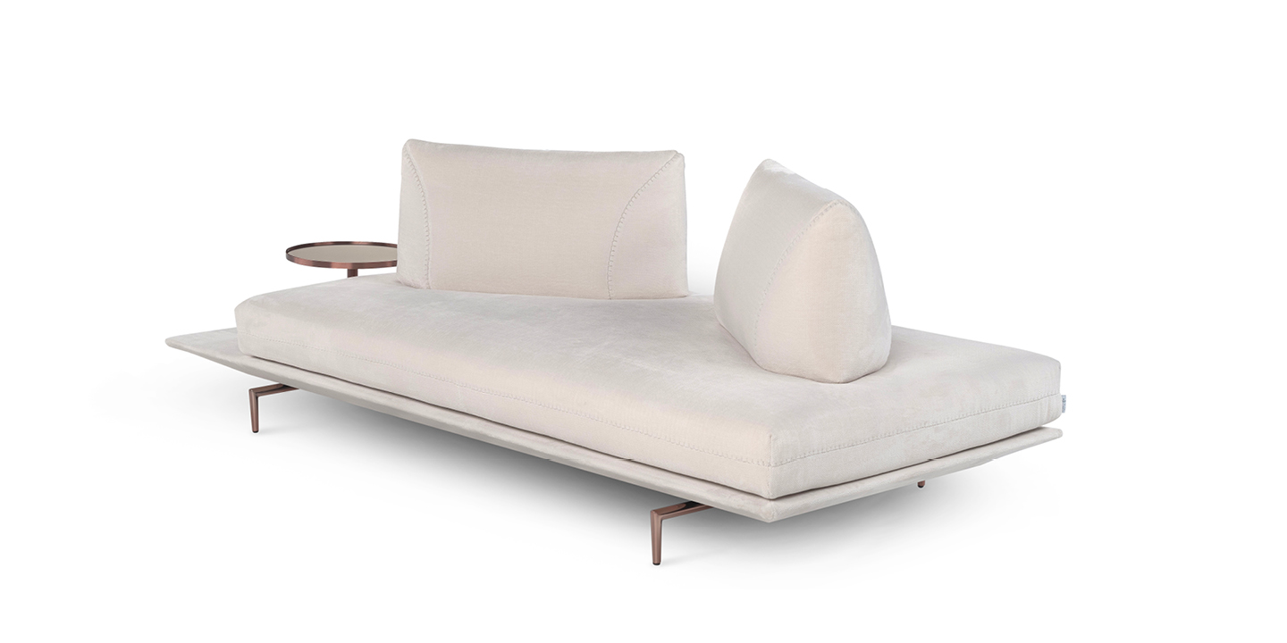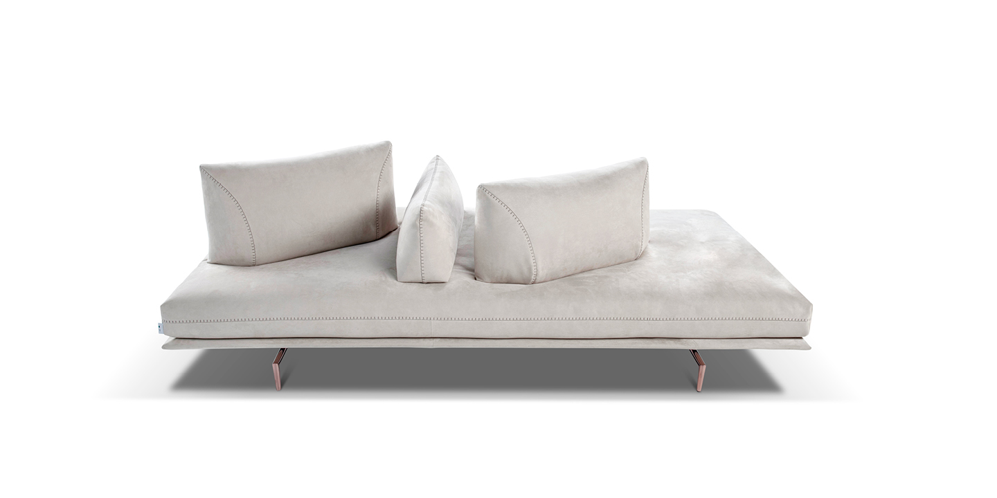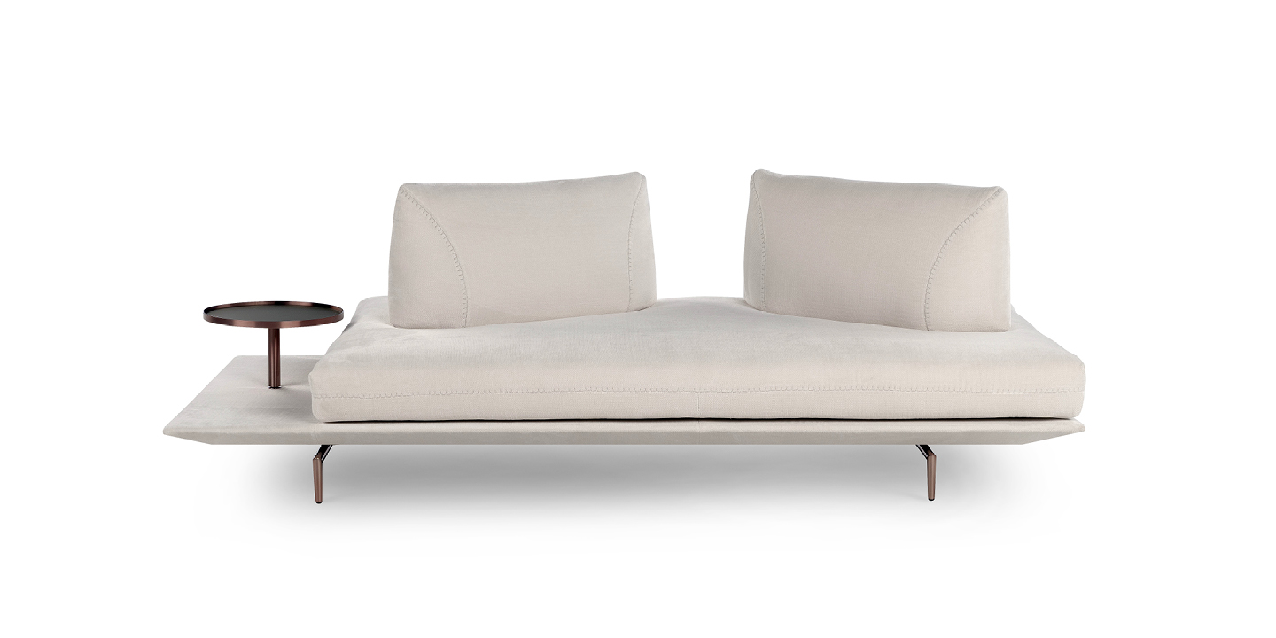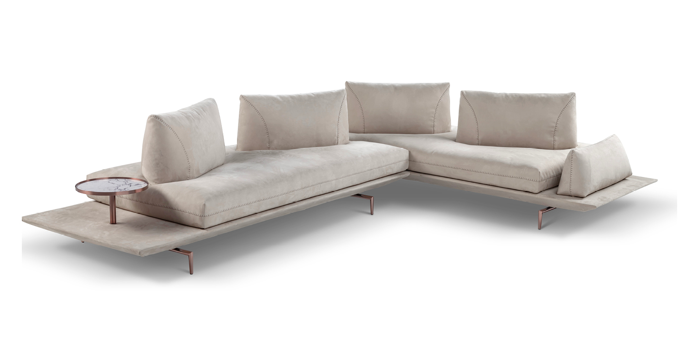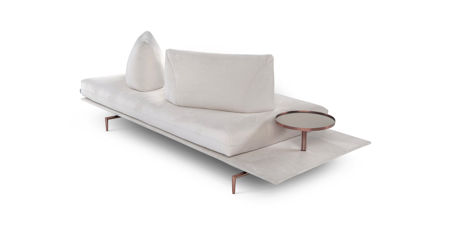 La versatilità è la cifra del divano Gianduiotto. Nasce, infatti, con schienale e bracciolo posizionabili liberamente per consentire molteplici posizioni nella seduta, inclusa quella frontale vis-à-vis o anche la posizione sdraiata. La sua natura aperta e destrutturata lo rende il protagonista ideale al centro dell’ambiente, con una cucitura decorativa sulle spalliere e sul perimetro della seduta che contribuisce a impreziosirne il disegno. Alcune versioni prevedono un prolungamento della base, disponibile come piano di appoggio o corredata di tavolino con le medesime finiture del piede. Il piede in metallo, in finitura rame, solleva il divano da terra e diventa un elegante elemento decorativo.